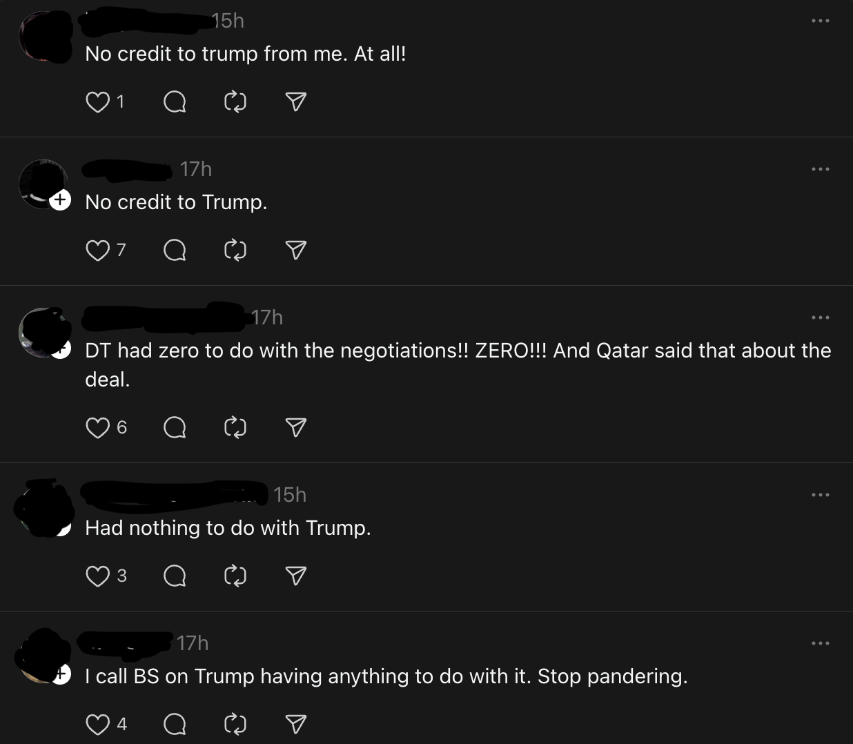 See below for *some* of the replies to my Threads post crediting Biden and incoming Trump administrations for “making progress on the hostage crisis.” Cue the yikes.